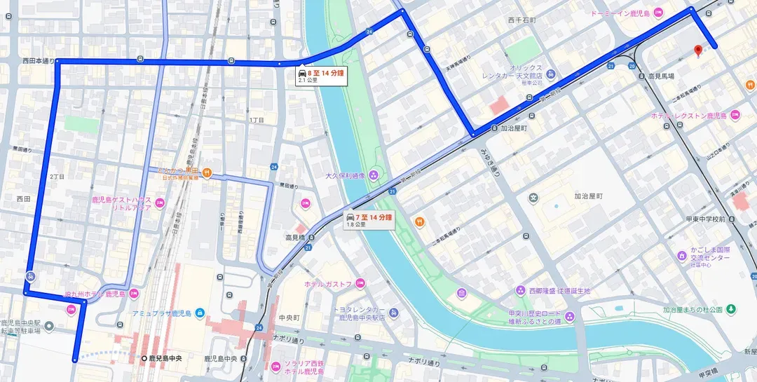 - 路線二、經濟實惠,大眾運輸:搭乘鹿兒島的市區電車或巴士也是非常方便的選擇,僅需約 16 分鐘即可抵達。您可以在鹿兒島中央車站前的電車站或巴士站搭乘往「天文館」方向的車輛,在「天文館通」站下車後,步行即可抵達飯店。
