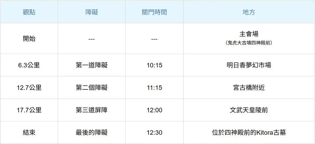 - 賽事起點/終點:龜虎古墳・四神館(キトラ古墳・四神の館)