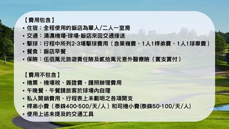 3. 擊球:行程中所列之 2 場擊球費用(含果嶺費、1 人 1 桿弟費、1 人 1 球車費)