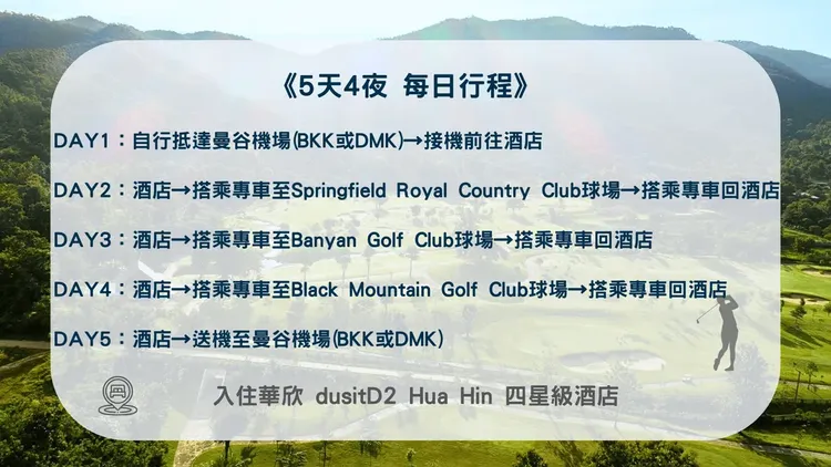 ※ 因行程接駁為四人一組接駁,建議同一組球友搭同航班抵達,如無法安排同航班,接駁會以最晚抵達旅客航班進行接駁,先抵達旅客請於機場等候(需同時為 BKK 或 DMK 機場)。