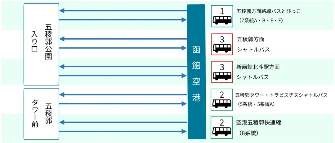 ② 五棱郭塔-Travistine 接駁巴士(5線/5線A)「五棱郭塔前」下車步行約7分鐘(550公尺),點擊查看機場接駁巴士資訊