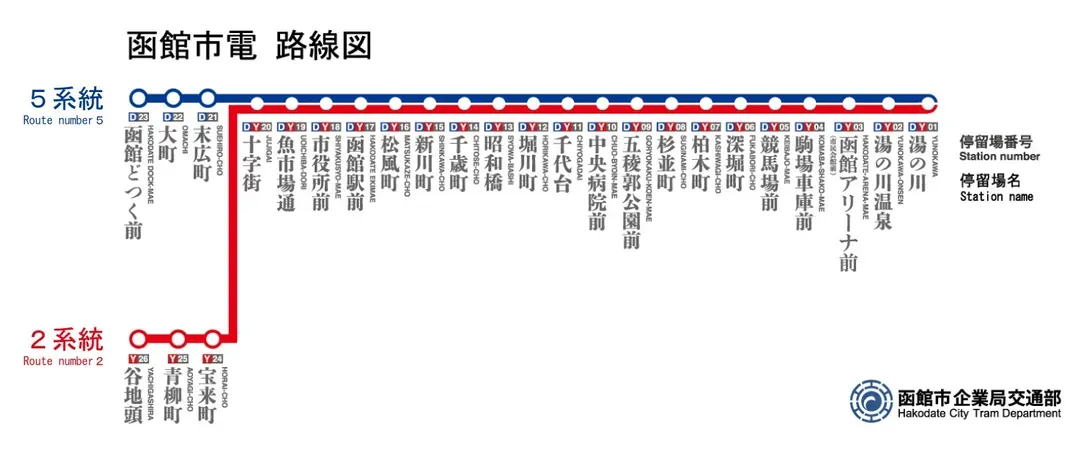 從『DY17-函館站前』搭乘路面電車5線或2線,行經5站至『DY11-千代台站』下車,步行約5分鐘(400公尺)即可抵達。