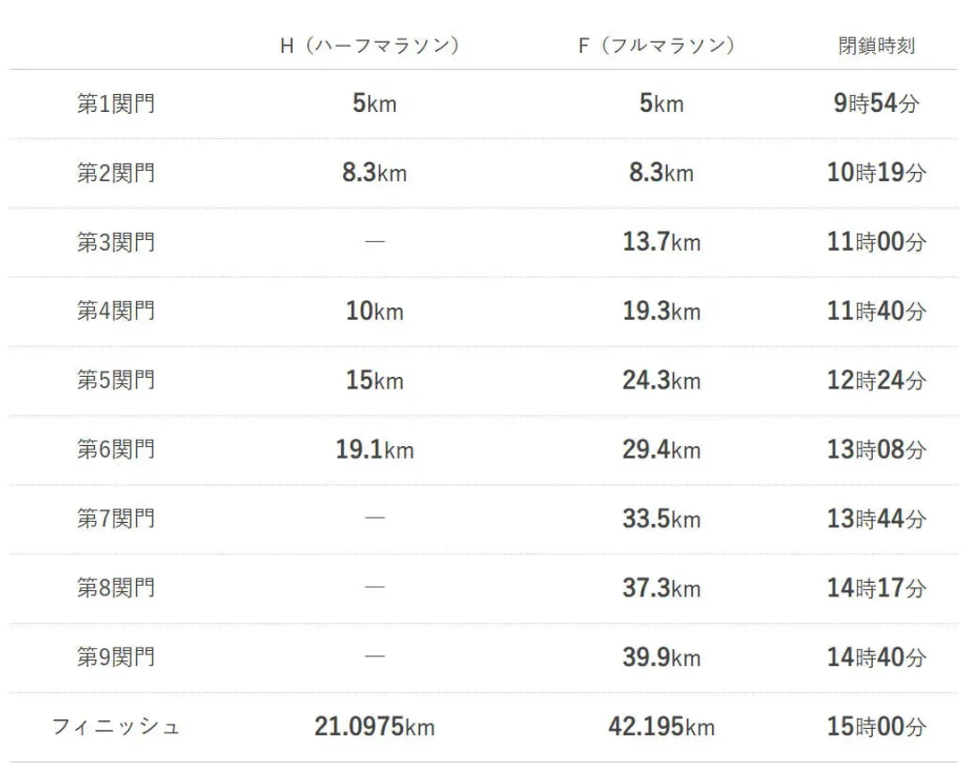 ① 將根據下列(規定的)時間關閉各檢查站(關門點),在此時間之後到達的選手將無法繼續比賽。