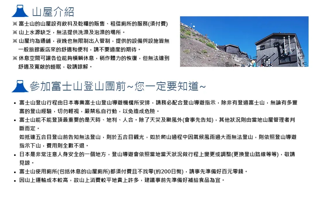 ★行程富士山山屋已預先取得,若您確定報名本行程,需先繳交預約作業金每人新台幣10,000元整,本公司方可受理並為您保留山屋及作業機位。《線上預約並非保證訂位成功,仍需以業務專員回覆確認為準》。
