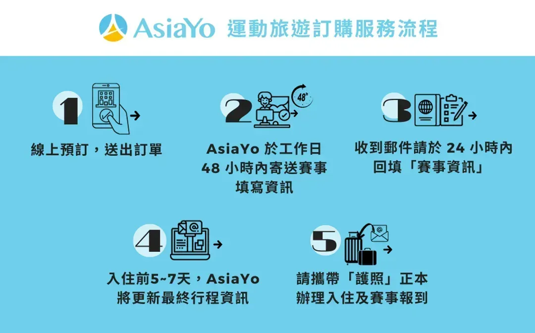 AsiaYo馬拉松賽事行程 保證參賽權+住宿套裝報名有超65%用戶會再次復購,深受跑者喜愛,台灣OTA馬拉松套裝市場市佔第一,保障賽事報名、住宿、景點行程、eSIM等旅遊需求一站購齊!