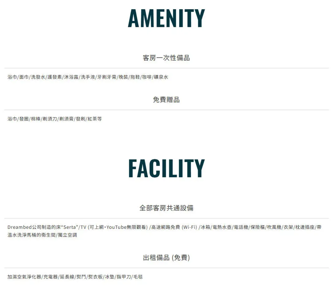 客房設施:電視(可上網)/免費高速網絡(Wi-Fi)/冰箱/電熱水壺/電話/保險箱/吹風機/衣架/床下儲物空間/床頭插座/Hit's 裝置(無限量 YouTube 觀看)/衛生間衛洗麗/Dream Master 床/獨立空調/毛巾/浴巾/牙刷、牙膏/洗髮水/護髮素/沐浴露/吹風機/棉籤/梳子/剃須刀/剃須膏/拖鞋/長袍/兒童用品(牙刷、拖鞋、睡衣)