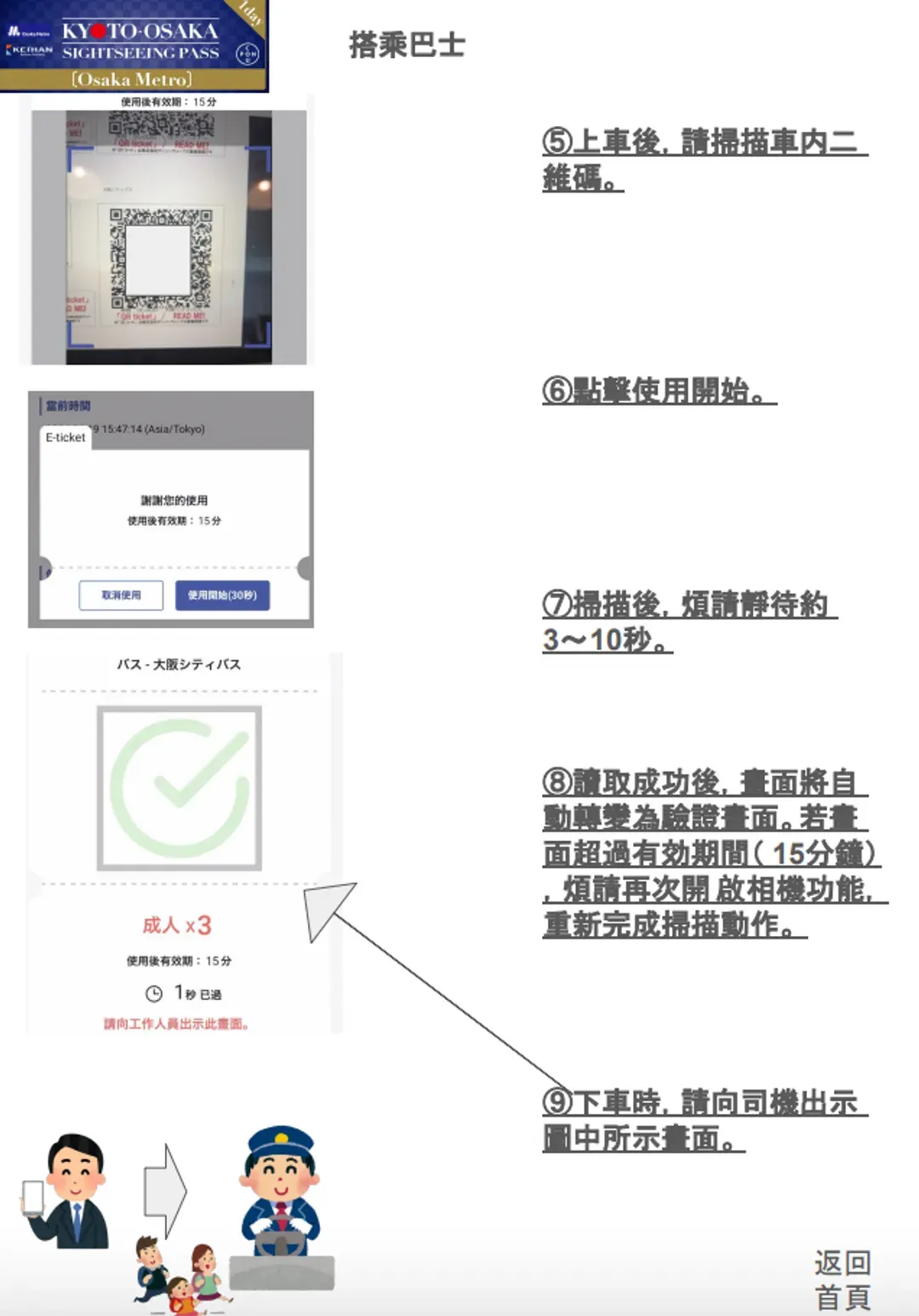 - 搭乘巴士時,請在下車前掃描車內顯示的專用QR Code,並在下車時向司機出示認證畫面。