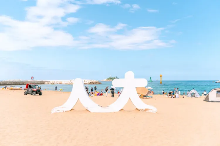 束草海水浴場以清澈的海水和細緻的沙灘聞名,其中以束草的韓文為發想的「人大」韓文字母造型物、標出全世界各國方向的巨大指南針、生動的海豚雕塑等吸引了人們的視線。