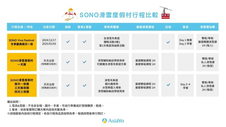 • SONO三天兩夜:安排更完整,可體驗不同雪道與雪上活動,適合家庭旅遊