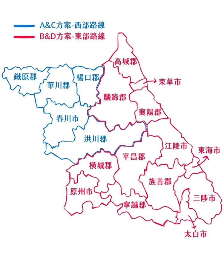 鐵原郡 철원군、華川郡 화천군、春川市 춘천시、楊口郡 양구군、洪川郡 홍천군