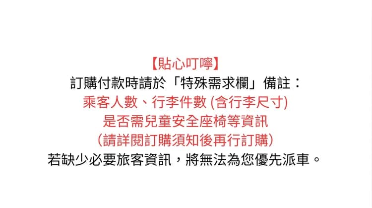- 付款時請務必於「備用聯絡方式」留下您的Line/Whatsapp/WeChat等通訊軟體帳號ID供司機聯繫。
