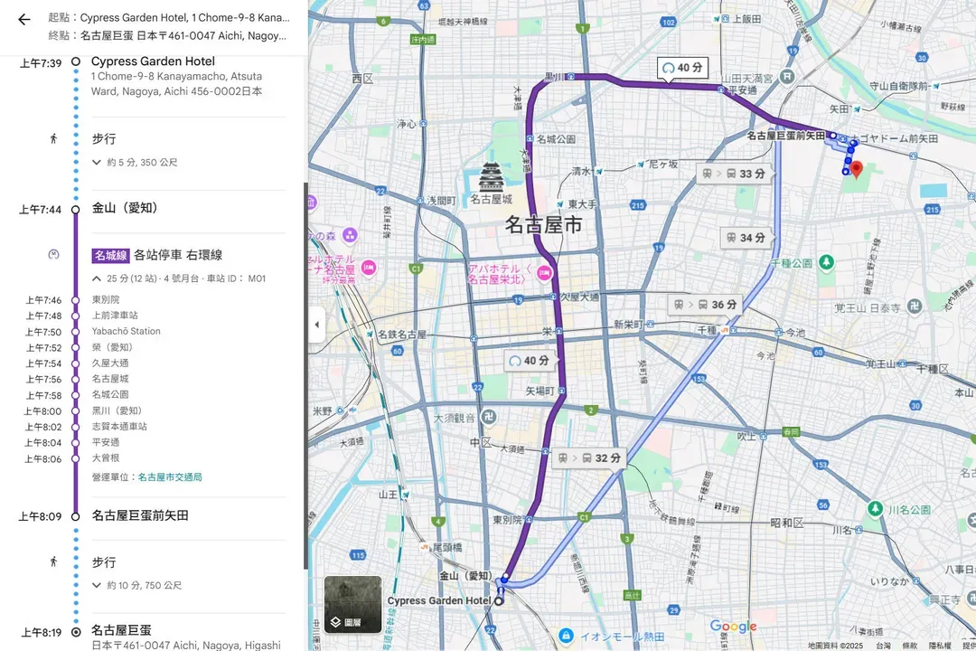 柏樹花園飯店(Cypress Garden Hotel)↔️物資領取/賽事會場(名古屋Vantelin Dome(バンテリンドーム ナゴヤ))
