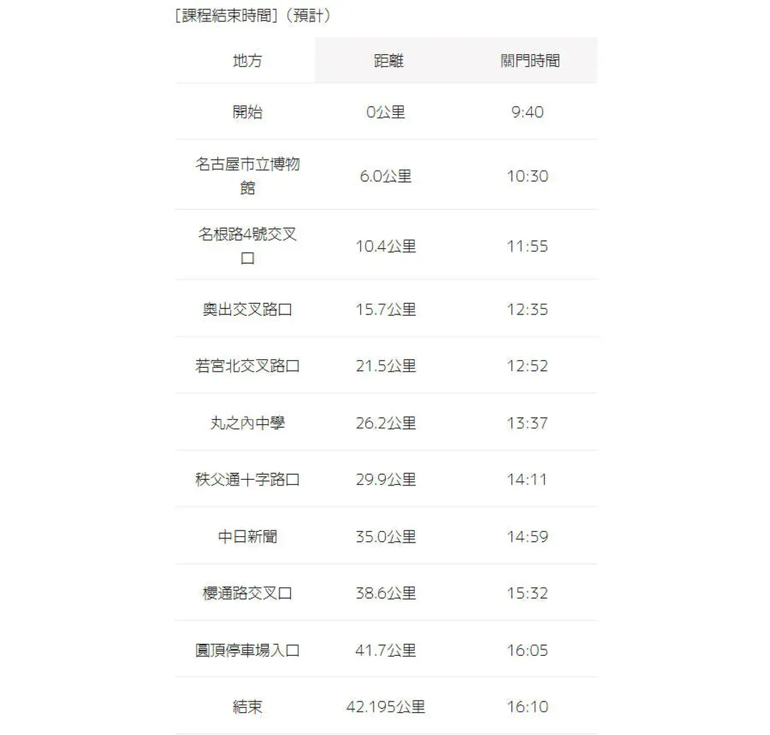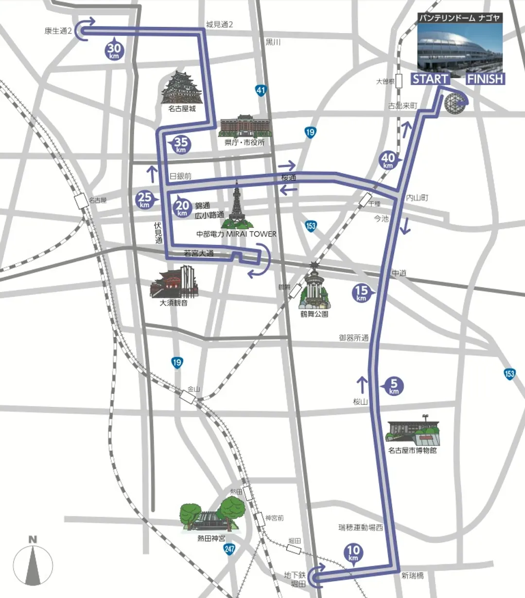 - 起/終點:名古屋Vantelin Dome(バンテリンドーム ナゴヤ),日本田徑聯合會,WA/AIMS 認證賽道。