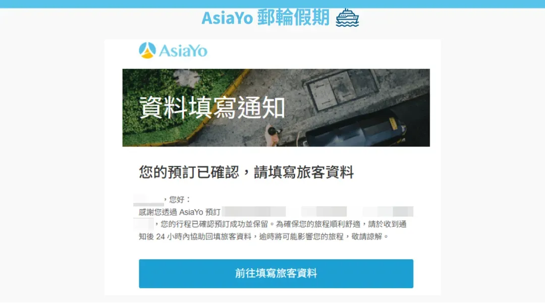 ※出發當日若因旅客個人因素需更改船票資訊,經船公司同意特例處理,更改費用NT$3,300將由AsiaYo暫先墊付,該費用由您全額負擔,無法豁免或減免。航程結束後將開立補款單,請您如期繳納,敬請配合。