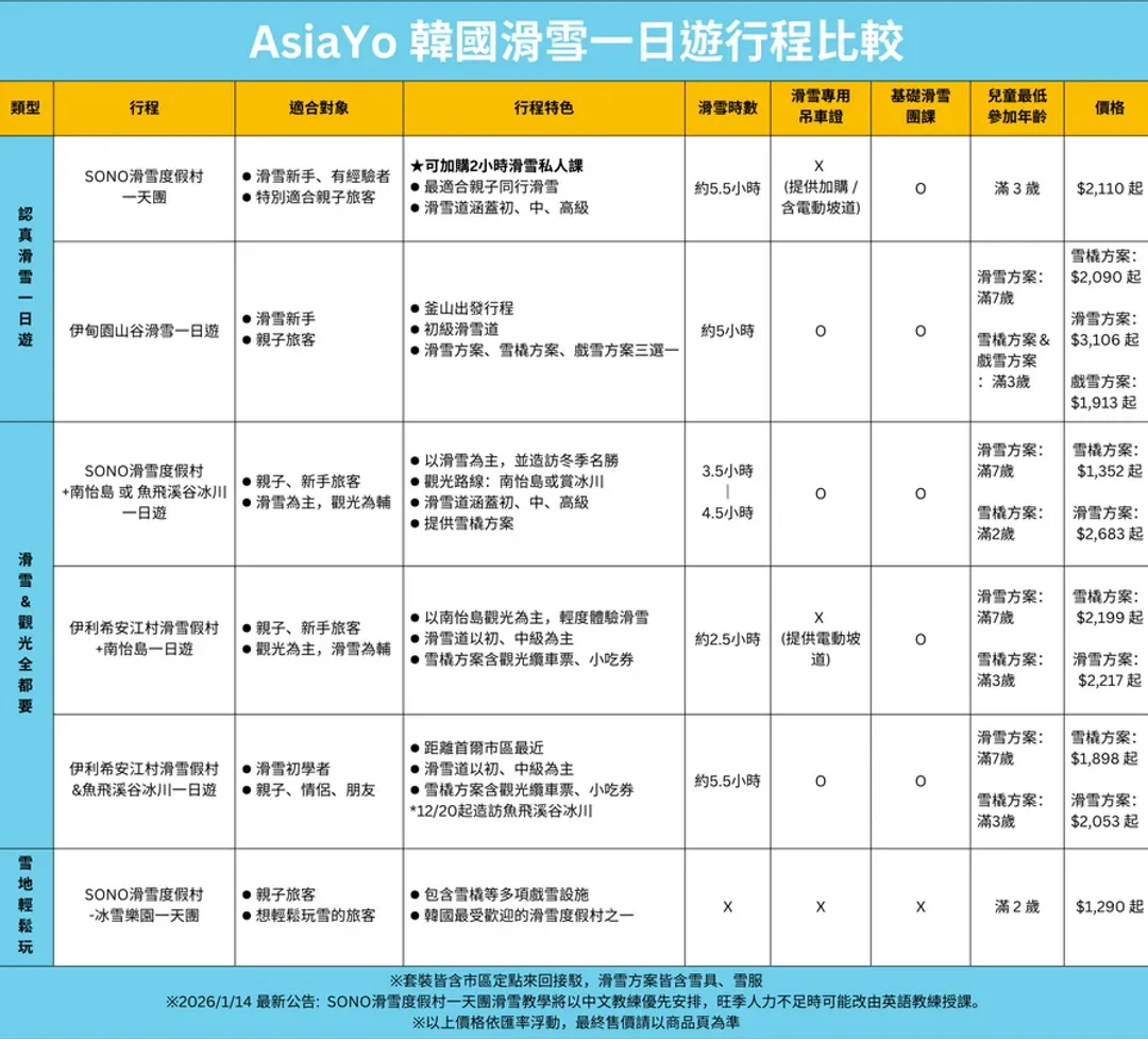 | 江原道龍平度假村 | 初級滑道6條、中級滑道5條、高級滑道14條 | ✅ | 滑雪新手、情侶、深度滑雪 | 2025/12/15-2026/2/28 | 教練課/三日遊-五日遊 | TWD 23,464 起 |
