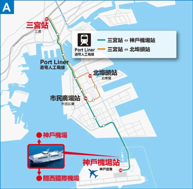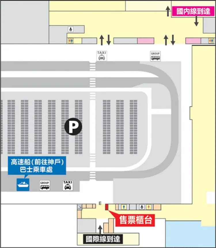 - Bay Shuttle神戶高速船(神戶ベイ.シャトル)售票櫃臺:關西國際機場第1航廈1樓・第2航廈皆有售票櫃檯。