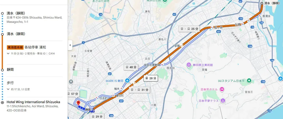 - 再步行約15分鐘(1.1公里)即可抵達靜岡永翼國際飯店(Hotel Wing International Shizuoka),回程亦可搭乘JR東海道本線返回東京車站。