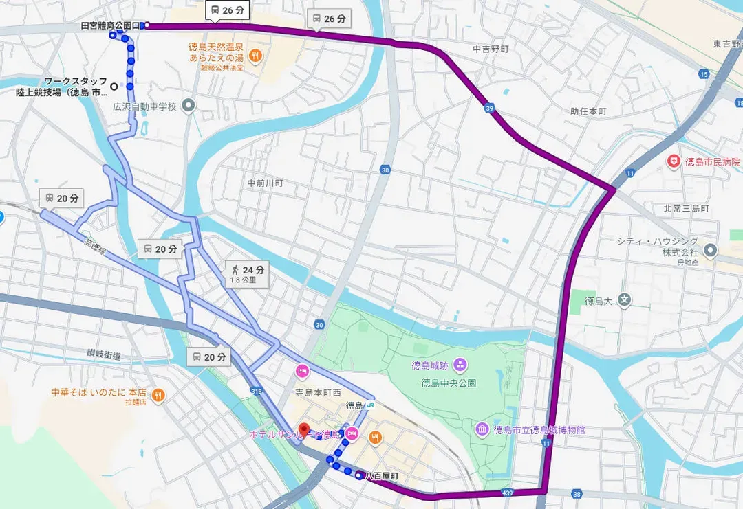 賽事會場終點(Workstaff田徑場 (德島市田徑場))➡️德島微笑飯店(Smile Hotel Tokushima)、德島大皇宮飯店 (THE GRAND PALACE TOKUSHIMA)