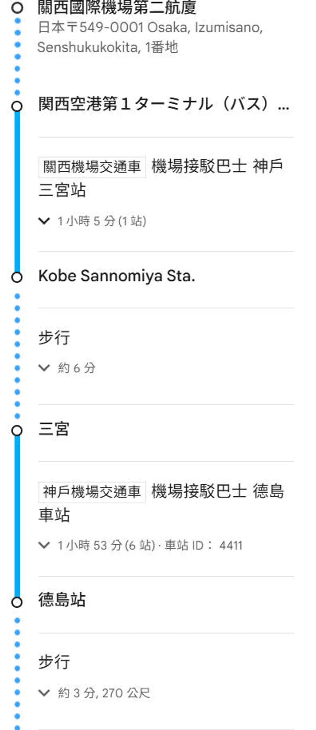 - 德島大皇宮飯店:從關西機場第一航站巴士樓搭乘機場接駁巴士往「神戶三宮站」,約1小時抵達神戶三宮站總站前,再從三宮站總站前換乘「神戶~德島」往德島方向搭乘約2小時抵達德島車站,步行4分鐘即可抵達飯店。
