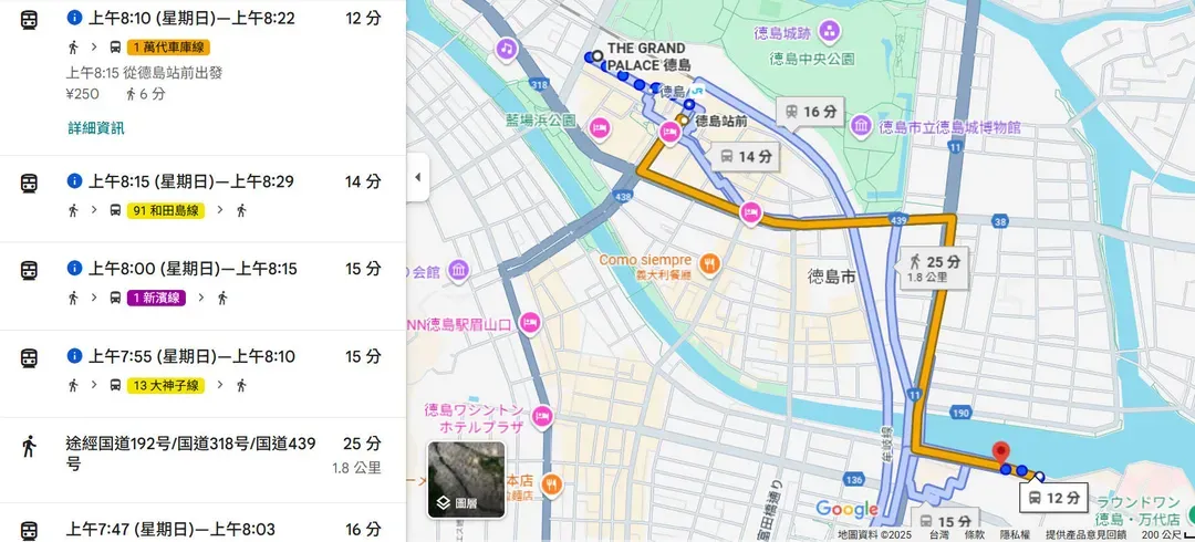 路線二、從德島車站搭乘「1萬代車庫線、1新濱線」搭至縣廳前(約6分),再步行3-4分鐘即可抵達賽事起點。