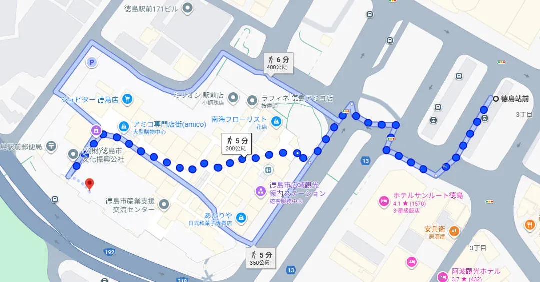 路線二、賽後從終點的徳島市陸上競技場走路約6分鐘(400公尺)到達「田宮體育公園口」公車站,搭乘「31中央循環線(市民醫院前・德島站前方面)」搭至八百屋町(約13分),下車後再步行8分鐘(550公尺)即可回到飯店。