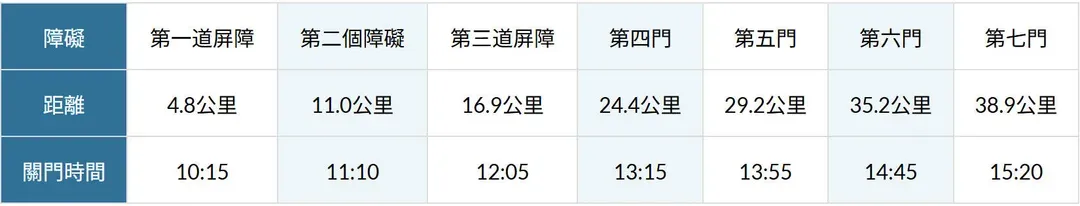 - 限制時間:7小時,7個限制點 (時間以第一波發令槍響為準)