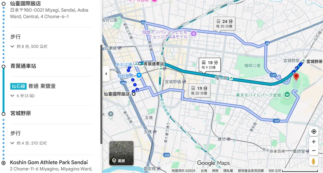 仙台國際飯店 (Sendai International Hotel)↔️賽事會場:仙台市田徑場(弘進橡膠 仙台運動員公園)(仙台市陸上競技場(弘進ゴム アスリートパーク仙台))