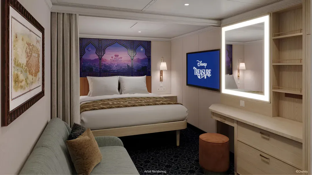 Disney Treasure 寶藏號將於 2024 年自佛羅里達首航,主要航行東加勒比海及西加勒比海行程。船身設計主題為著名的「阿拉丁」風格,展現富麗堂皇的中東宮廷,並以魔毯、神燈為主題,為旅客展開探險航程。