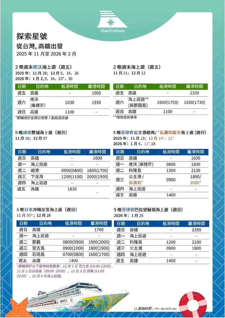 ※ 全程均屬自由行,恕無領隊隨程服務,自登船起,服務皆由麗星郵輪 探索星號提供。