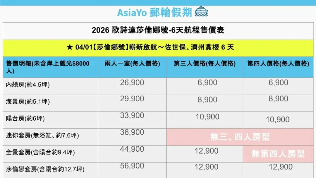 ※出發當日若因旅客個人因素需更改船票資訊,經船公司同意特例處理,更改費用NT$3,300將由AsiaYo暫先墊付,該費用由您全額負擔,無法豁免或減免。航程結束後將開立補款單,請您如期繳納,敬請配合。