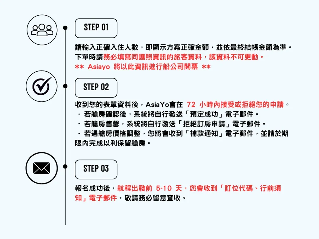 1. 下單時請務必填寫同護照資訊的旅客資料(英文姓名拼英、出生年月日、性別),該資料不可更動。AsiaYo 將以此資訊進行船公司開票,後續不會另行要求提供護照影本。