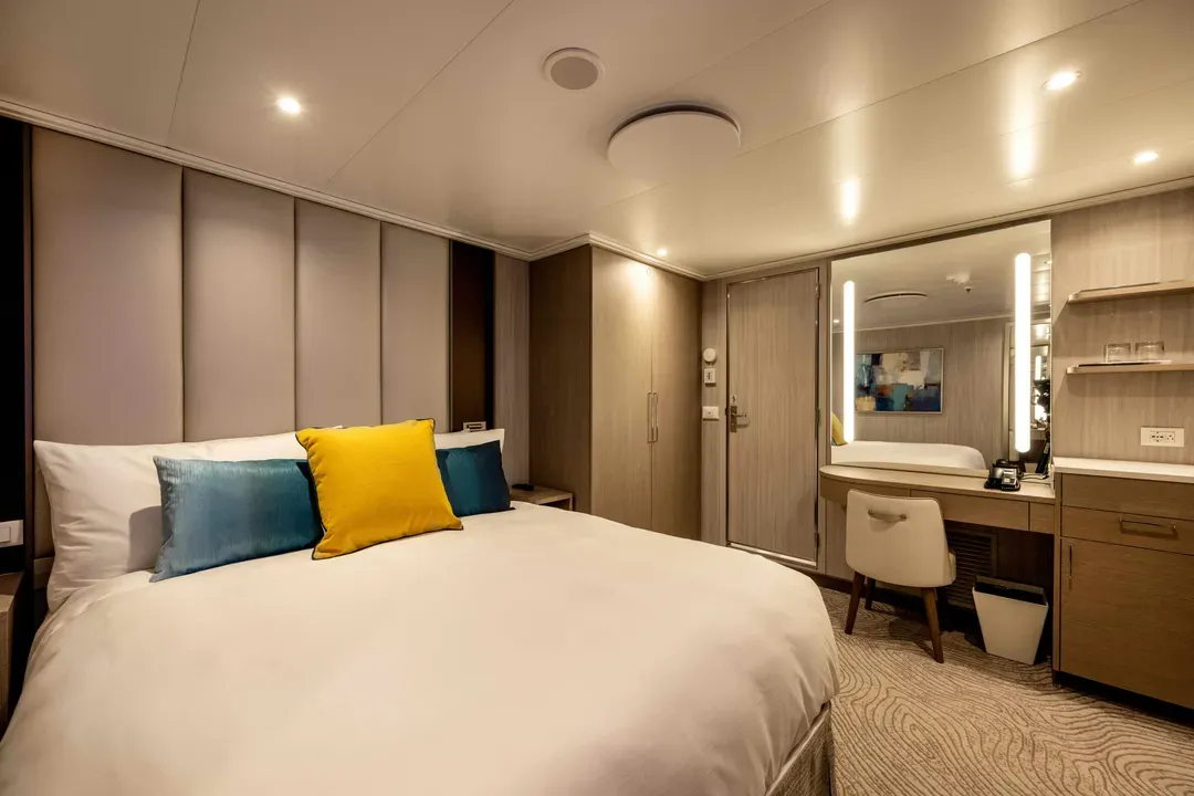 視野開闊的客艙。無論是悠閒的深藍色海景,還是地平線上新城市的迷人風光,在客艙內就能捕捉各種美好的風景。該客艙包括內艙的所有便利設施,以及通透開闊的海景。