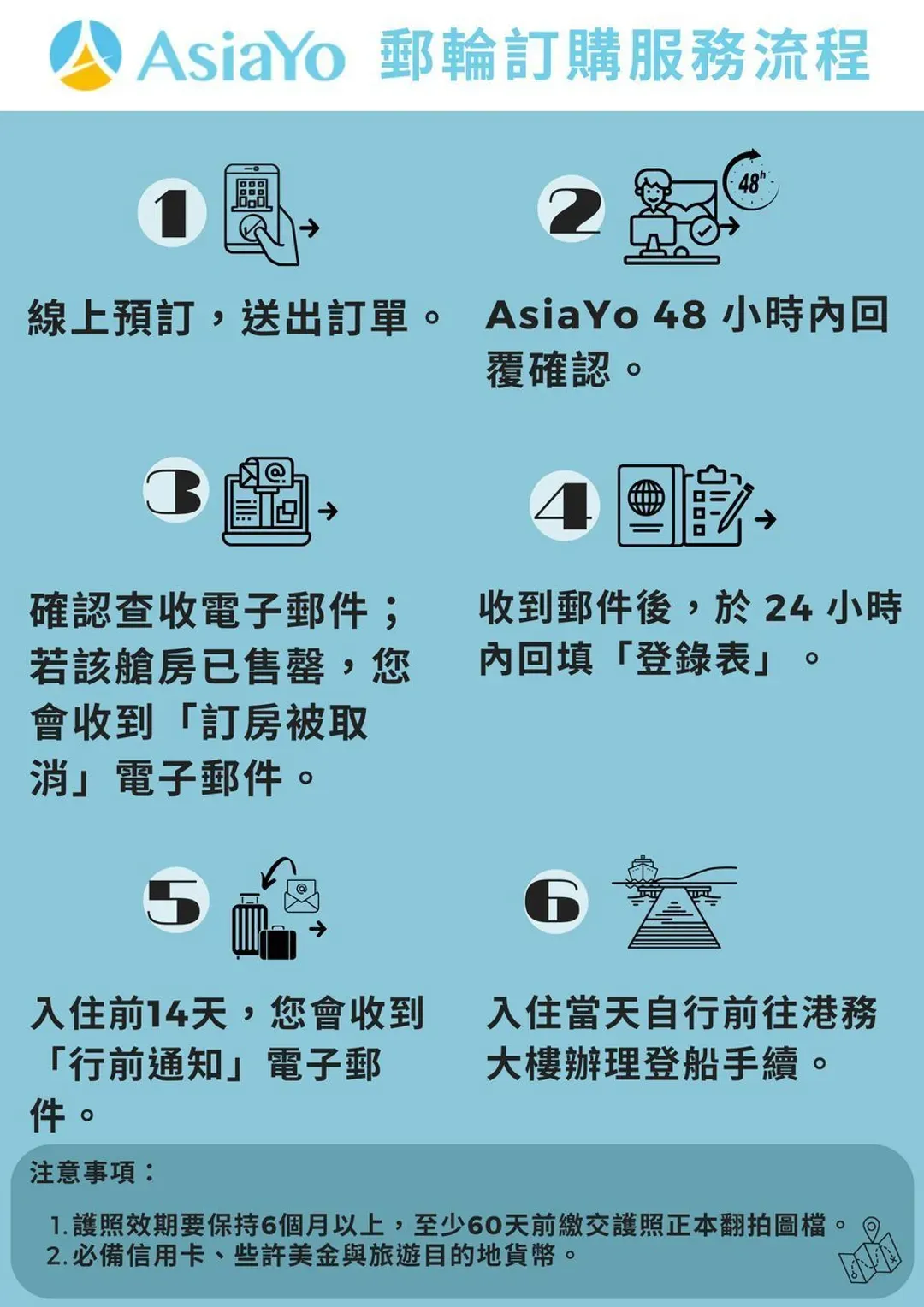 1. 請旅客務必檢查護照有效期達六個月以上,並請告知同行旅客務必攜帶護照以辦理登船手續。