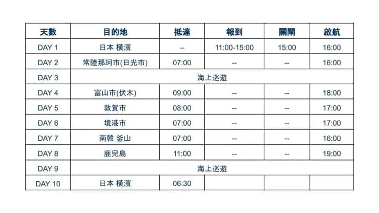 10. 此商品為單訂船票,不含旅行業責任保險,建議您自行投保旅遊平安險、海外醫療險、旅遊不便險。