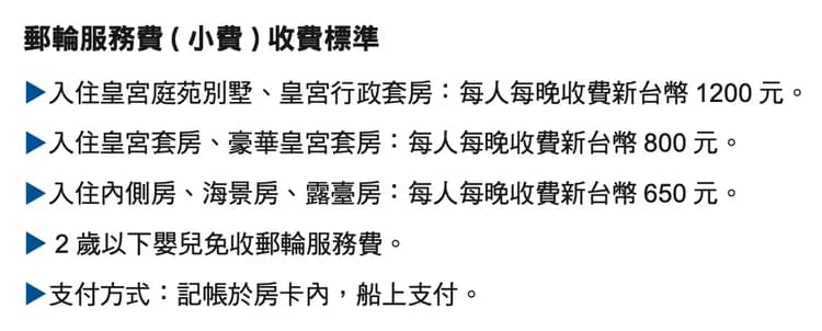 <郵輪艙房服務費依郵輪公司公告為準,費用將自旅客的船上消費帳戶計算並由郵輪公司收取>