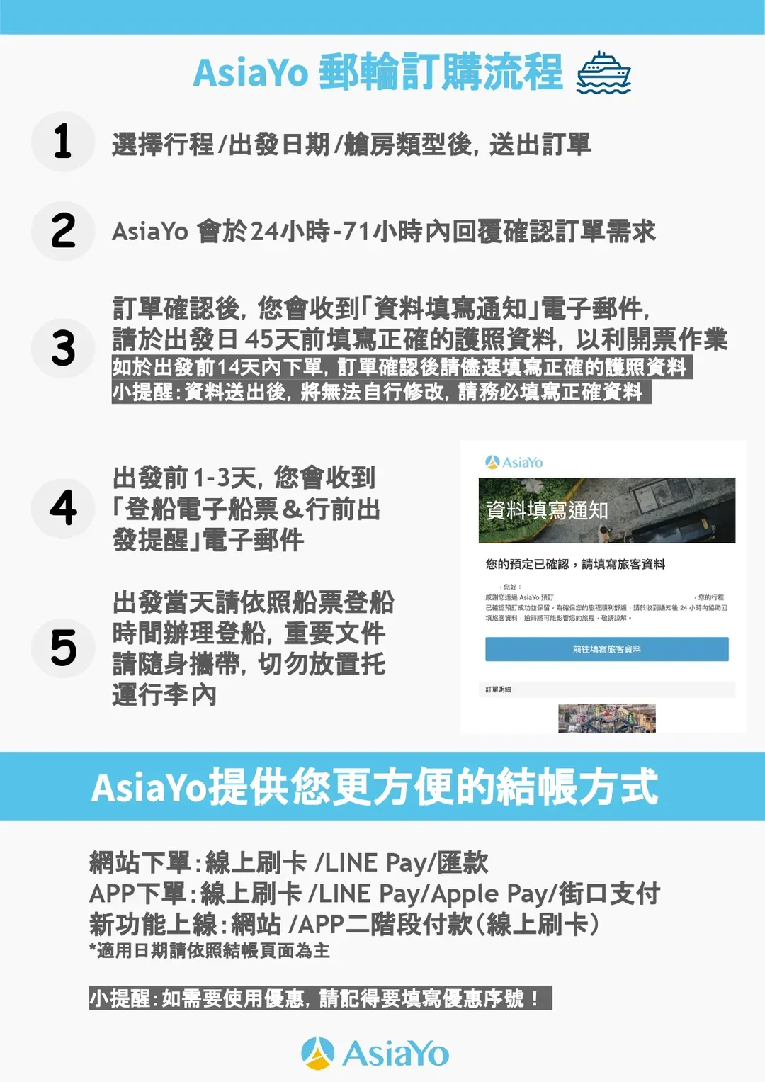※ 旅客於簽約時支付本公司委託訂艙房費用之金額,並提供與護照相符之正確名單,以確保訂位與雙方權益。(如資料不符、有誤等,AsiaYo會依據船公司規定收取修改費&艙房重訂費等作業金)