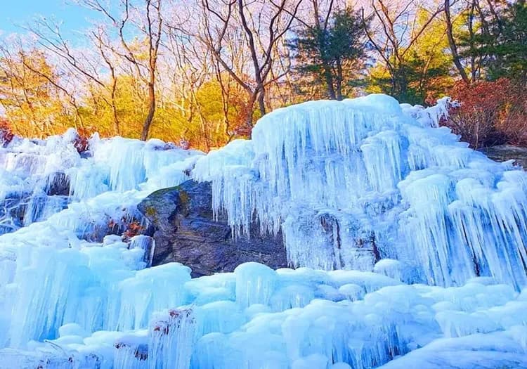晶瑩剔透的冰柱層層相疊,跟周圍茂密森林交織,場面超震撼!站在木橋上,無需刻意構圖,隨手一拍都是完美的打卡背景。