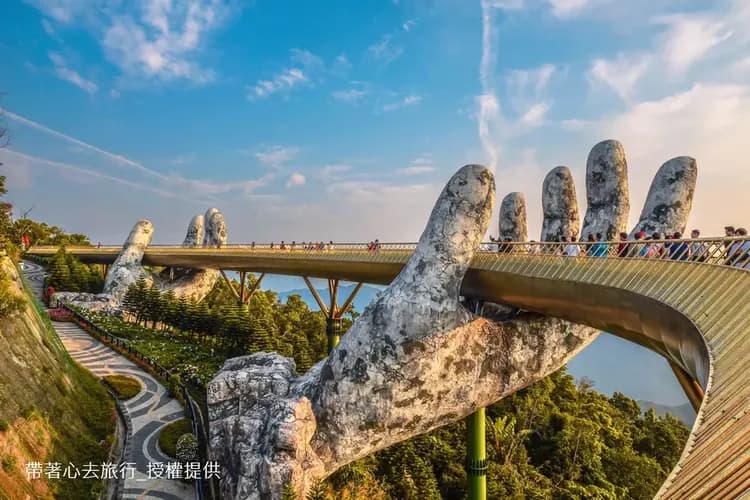 - 黃金佛手橋:佇立在半空中的一雙佛手托住黃金橋,就像一條金色緞帶,全長約150公尺,行走在海拔超過1400公尺的佛手上,鳥瞰整個峴港及山茶半島絕景。