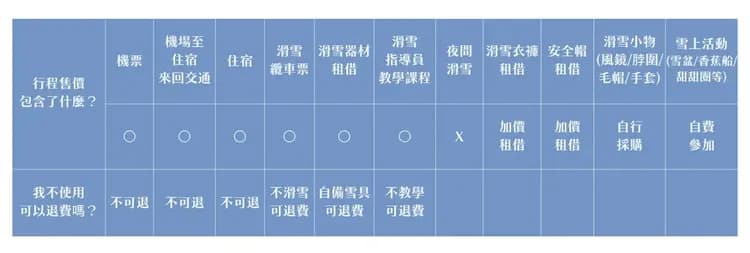 7.全程不需要滑雪教學者每人可扣NT. 4,500 元。