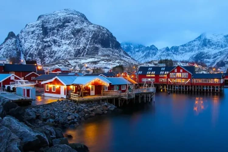 坐落在羅浮敦群島的東南部,北極圈秘境裡的重要組成部分,天邊的彩霞倒映在靜謐的水面,漁人小屋炊煙裊裊,被譽為《挪威最美村莊》。
