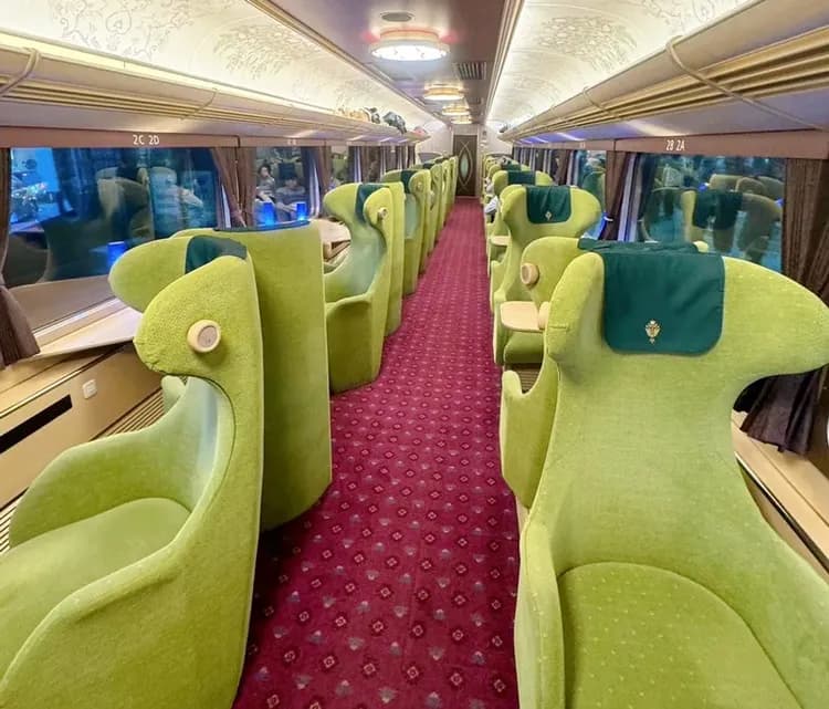 整部列車以1300年前的奈良歷史為主題,從內到外都非常考究,列車名稱「あをによし(AONIYOSHI)」即奈良古詩詞中的枕詞,車體使用了天平時代(西元729~749年)象徵「冠位十二階」的最高級色,內部裝飾能看到正倉院寶物所使用的天平紋樣,被譽為「行走的正倉院」。