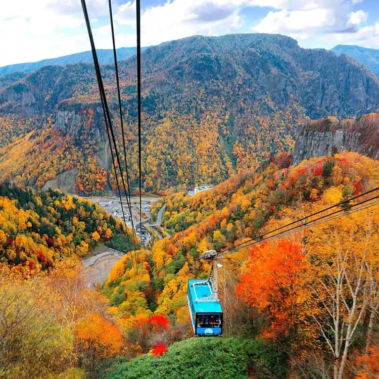 北海道大雪山國立公園是日本最早染秋色的地方,九月上旬起,最高峰─旭岳,以及黑岳的山林就開始變色,山峰的新雪與紅葉形成絕妙的對照,搭乘空中纜車可觀賞白雪的雄偉連峰與山間紅葉輝映的絕色景緻。(從層雲峽溫泉街坐纜車可以飛向大雪山的懷抱,纜車7分鐘可以到黑岳五合目,是秋天賞楓名所)。