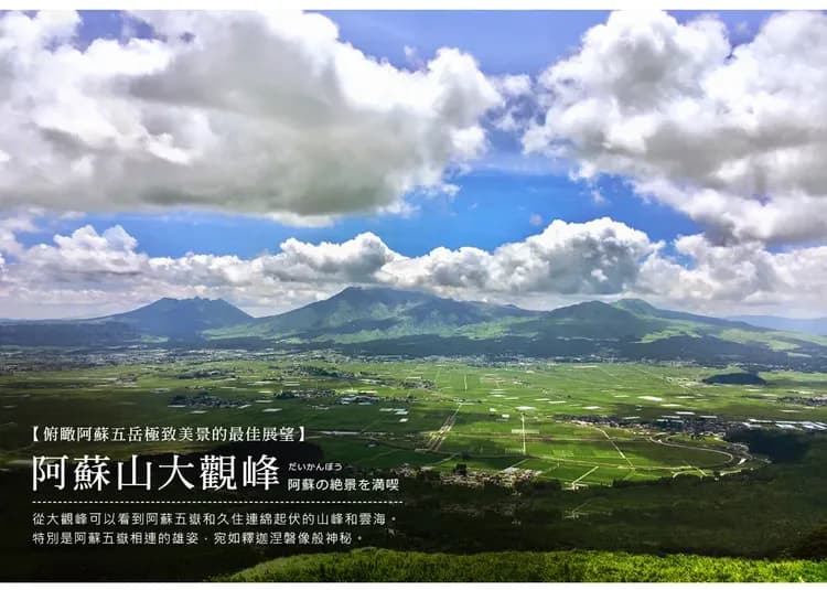 熊本縣-阿蘇大觀峰展望台【眺望阿蘇山景色的最佳地點】-湯布院藝術小鎮散策~湯之坪街道【漫步在可愛雜貨店和咖啡店的湯之坪】-金鱗湖森林小徑【如仙境般的湖泊】-免稅店-自由前往博多運河城/或天神商圈-福岡