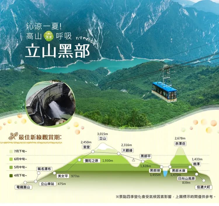夏日阿爾卑斯山脈路線(七種交通工具體驗): 立山車站(中部山岳國家公園)-室堂(立山主峰)-火山湖秘境・御庫裏池散策-黑部水壩觀光放水(期間限定:6/26-10/15)-扇澤