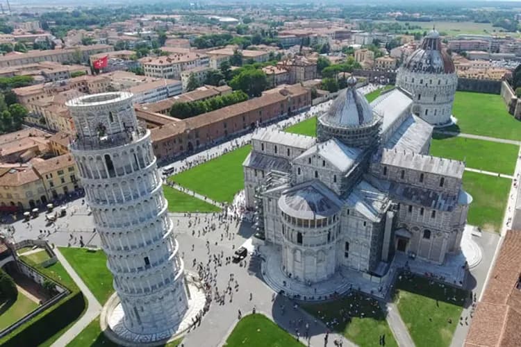 已有八百年歷史,在美麗如茵的奇蹟廣場上,矗立著主教堂、洗禮堂與鐘樓斜塔等。