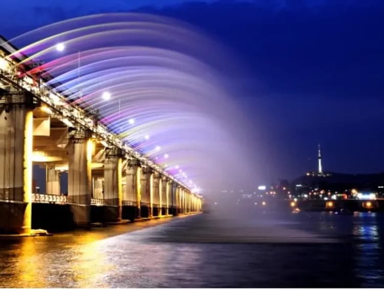 月光彩虹噴泉設置於盤浦大橋570m區間兩側,合計全長1,140m,共裝有380個噴嘴,利用抽水機將漢江水抽引上來,再噴灑於20m下的漢江水面,為新概念的噴泉。