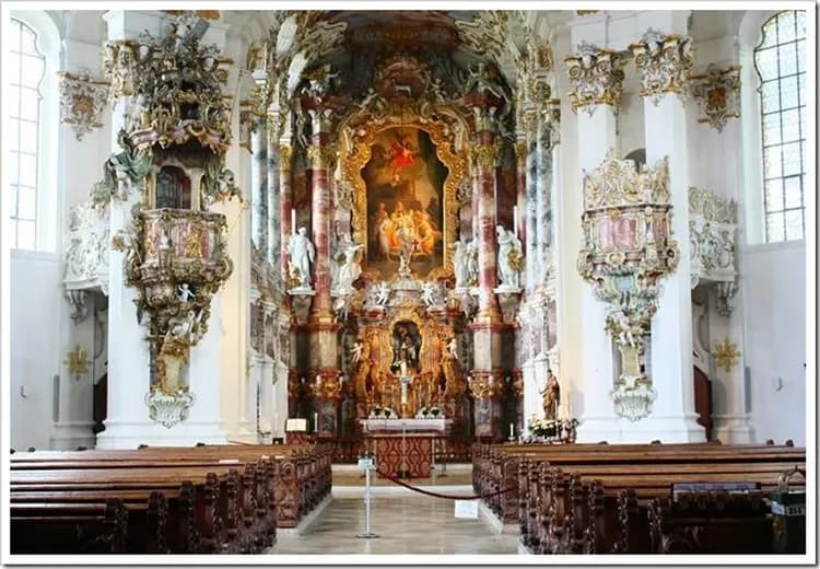 天花板的濕壁畫是登峰造極的精品,運用高超的繪畫技巧在一個平面上畫出立體的感覺,令人眼睛為之一亮,於18世紀德國宗教建築中最崇高傑作,被稱為《巴伐利亞草原奇蹟》。