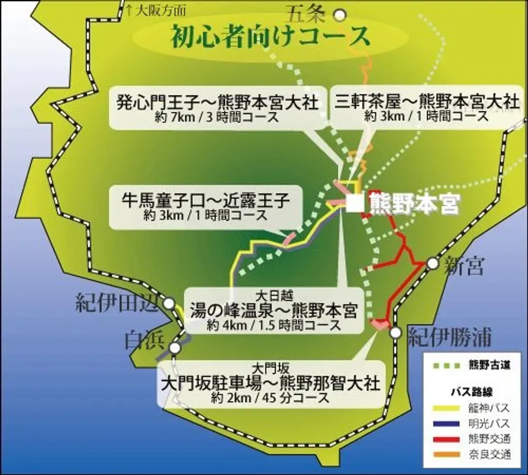 除此之外,還有從田邊沿海岸線向那智新宮出發的「大邊路」、從高野山向熊野出發的「小邊路」,以及從吉野向熊野本宮出發的大峰奧丘道連接伊勢和熊野的「伊勢路」等路線。