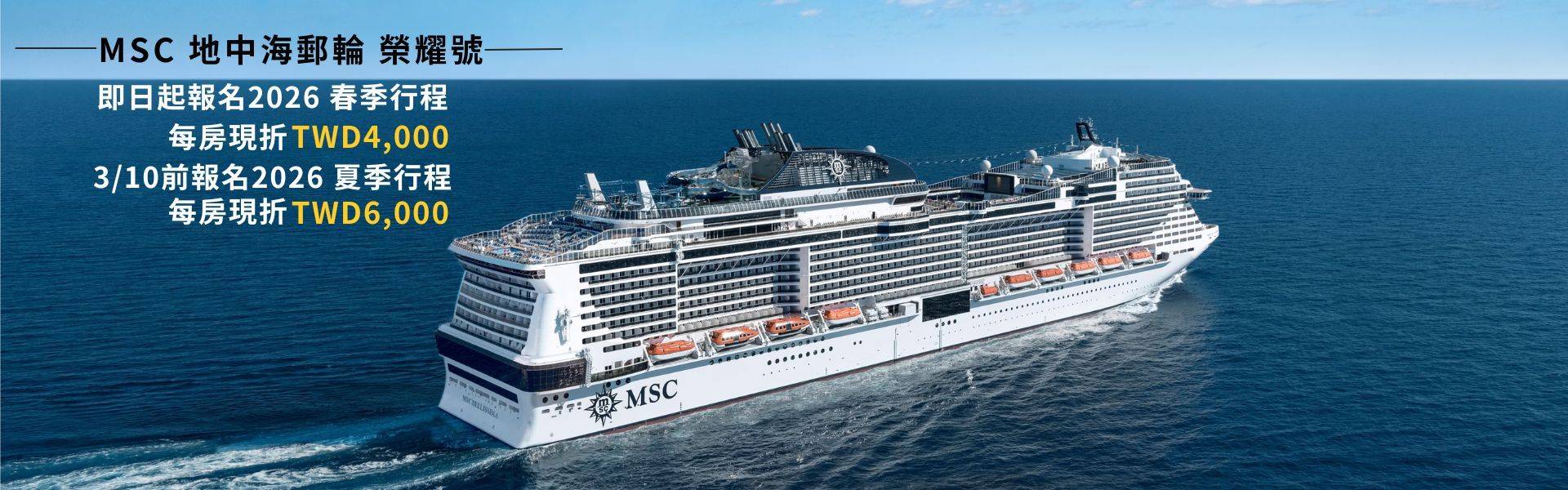地中海郵輪隆重來台,精心打造專屬亞洲航線——推出2026春季與夏季全新航程,航線途經沖繩、石垣島、宮古島、福岡、佐世保、鹿兒島、宮崎、濟州與釜山。除了經典沖繩郵輪之旅,春季首次推出MSC高雄出發航次(3/8、3/12),另有MSC榮耀號賞櫻專屬航程(3/23),體驗極致奢華的海上假期。早鳥優惠熱銷中,加入AsiaYo會員預訂MSC郵輪再享專屬折扣價格,快來選擇適合你的郵輪假期! 2026春季航程早鳥優惠預訂享每間艙房TWD 4,000折扣 ! 2026春季限定3/12、3/18航程,指定訂購內艙、遮蔽陽台艙享同房第二位半價優惠 ! 2026夏季航程早鳥優惠3/10前預訂享每間艙房TWD 6,000折扣 !