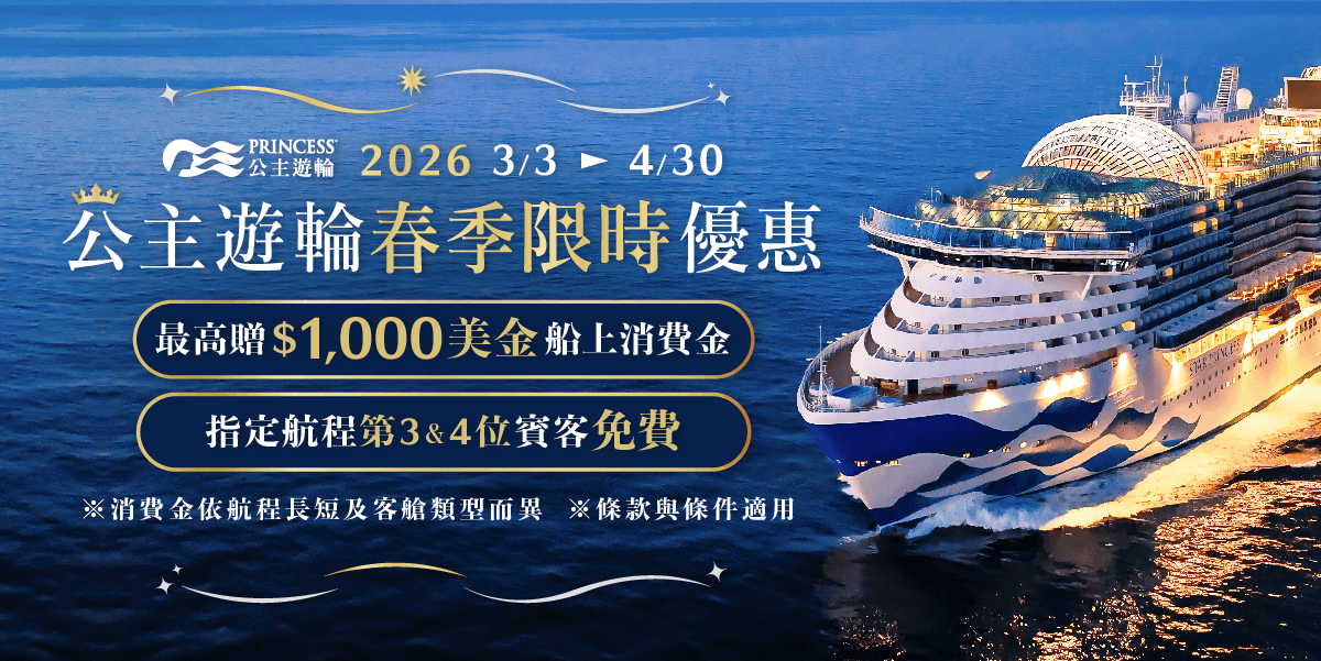公主遊輪『紅寶石公主號』提供從舊金山,加州登船出發前往阿拉斯加和夏威夷航程,高評價Fly-Cruise遊輪旅遊行程,自費前往出發地,讓AsiaYo帶你感受全新豪華遊輪體驗! 【公主遊輪】春季限時促銷 優惠日期:2026年3月3日(星期二)– 2026年4月30日(星期四) 優惠詳情:最高每間 $1,000 美金船上消費金 (OBC) + 指定航程第 3 位與 第 4 位賓客免費 ❗最高每間 $1,000 美金船上消費金: 適用於所有艙等,包含 Sanctuary 級別(僅限第 1 位與 第 2 位賓客)。 **船上消費金依遊輪航程長短及客艙類型而異,以“信用額度”形式發放,並自動記入賓客的船上帳戶中,且以船上使用的貨幣為準。(如:紐澳航線發放 AUD 澳幣) - 內艙與海景外艙 * 6 至 8 天的航程每位賓客可享美金 50 元的船上消費金;* 9 至 12 天的航程每位賓客可享美金 75 元的船上消費金;* 13 至 17 天的航程每位賓客可享美金 125 元的船上消費金*18 天或以上的航程每位賓客可享美金 200 元的船上消費金。 - 陽台艙 * 6 至 8 天的航程每位賓客可享美金 75 元的船上消費金;* 9 至 12 天的航程每位賓客可享美金 125 元的船上消費金;* 13 至 17 天的航程每位賓客可享美金 175 元的船上消費金;* 18 天或以上的航程每位賓客可享美金 300 元的船上消費金。 - 迷你套房艙與標準套房艙 * 6 至 8 天的航程每位賓客可享美金 100 元的船上消費金;* 9 至 12 天的航程每位賓客可享美金 200 元的船上消費金;* 13 至 17 天的航程每位賓客可享美金 300 元的船上消費金;* 18 天或以上的航程每位賓客可享美金 500 元的船上消費金。 ❗第 3 位與 第 4 位賓客免費: 僅適用於指定航程。 - 僅適用於免費遊輪票價,不包括稅賦、政府規費及港埠費用以及所需的遊輪費用和支出。 🚫優惠不適用晚鳥航次 🚫優惠僅適用於新預訂,選定航程,名額有限(售完為止)。 🚫優惠可能不允許進行行程變更或退款。 🚫優惠不可更名。